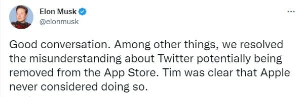 “Buena conversación. Entre otras cosas, resolvimos el malentendido sobre la potencial salida de Twitter de la App Store. Tim aclaró que Apple nunca consideró hacer eso.” Escribió, Elon Musk.